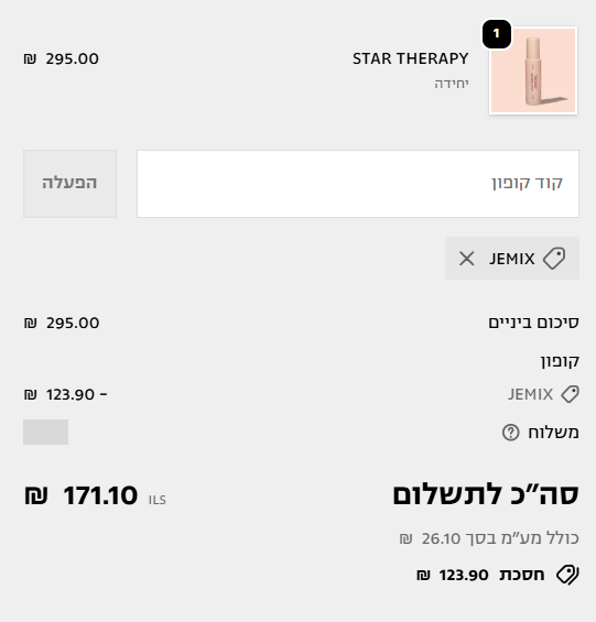 לאחר הפעלת קוד הקופון הבלעדי, הופעלה הנחה מרשימה של 123.90 ש”ח, והמחיר הסופי התעדכן ל-171.10 ש”ח.