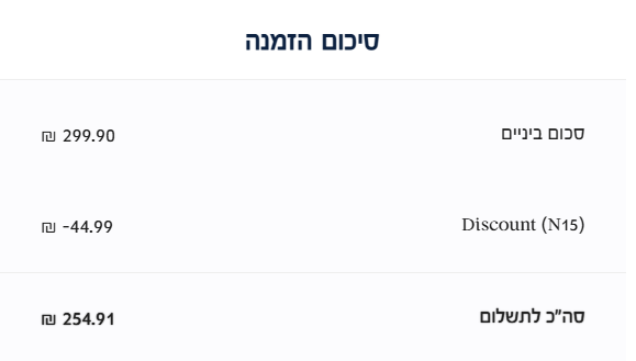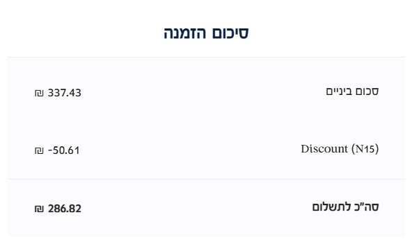 לאחר הפעלת קוד הקופון, הופעלה הנחה של 50.61 ש”ח, והסכום לאחר ההנחה התעדכן ל-286.82 ש”ח בלבד.